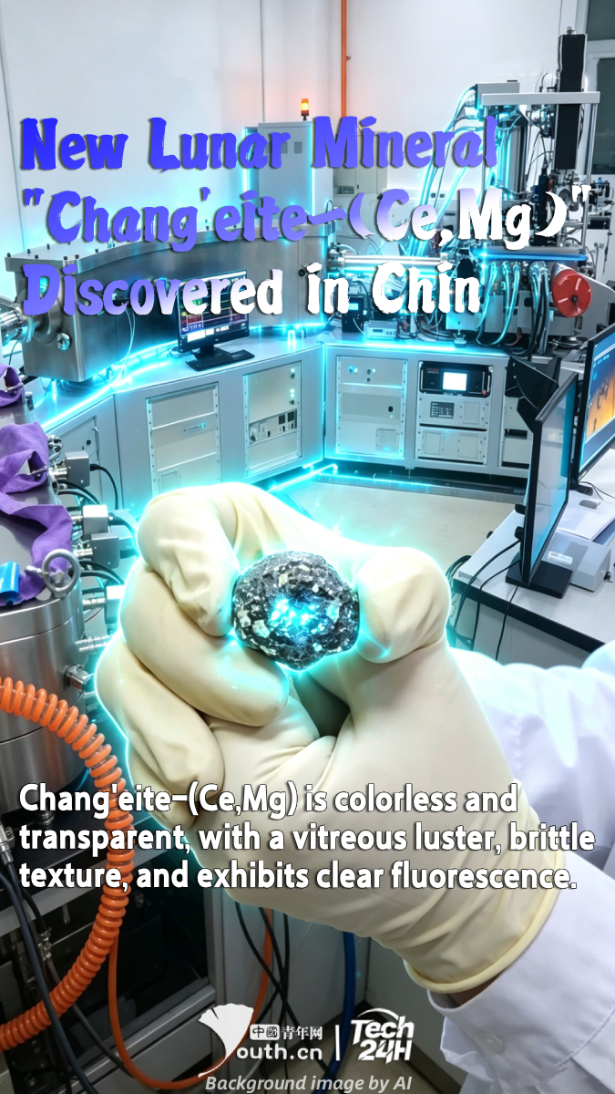 【#Tech24H】The discovery and application of a new lunar mineral, Chang’eite-(Ce,Mg), has been officially approved, making it the eleventh new lunar mineral discovered by humankind. Chang’eite-(Ce,Mg) is colorless and transparent, with a vitreous luster, brittle texture, and exhibits clear fluorescence. Its grain size ranges from about 3 to 25 micrometers, generally smaller than 10 micrometers, roughly 1/25 the diameter of a human hair. Chang’eite-(Ce,Mg) was found in the first lunar meteorite to fall within China's territory. The mineral’s fluorescence effect gives it promising potential applications in LED luminescent materials. Its rare earth ratio, magnesium and iron content, and crystal structure variations provide important references for artificial synthesis. [ By Zhang Liyan | Tang Ruohan ]