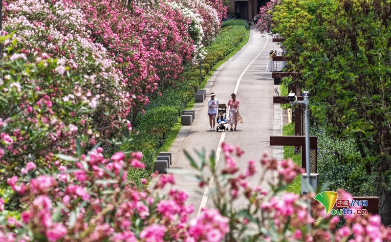 Beijing, April 24 (Youth.cn) - On April 23, 2026, oleanders quietly burst into bloom along the riverbank of the Yongjiang River’s south shore in Nanning City, Guangxi Zhuang Autonomous Region. Their brilliant, fire-like flowers created a picturesque scene, drawing many citizens to enjoy the spring scenery. Photo/CFP