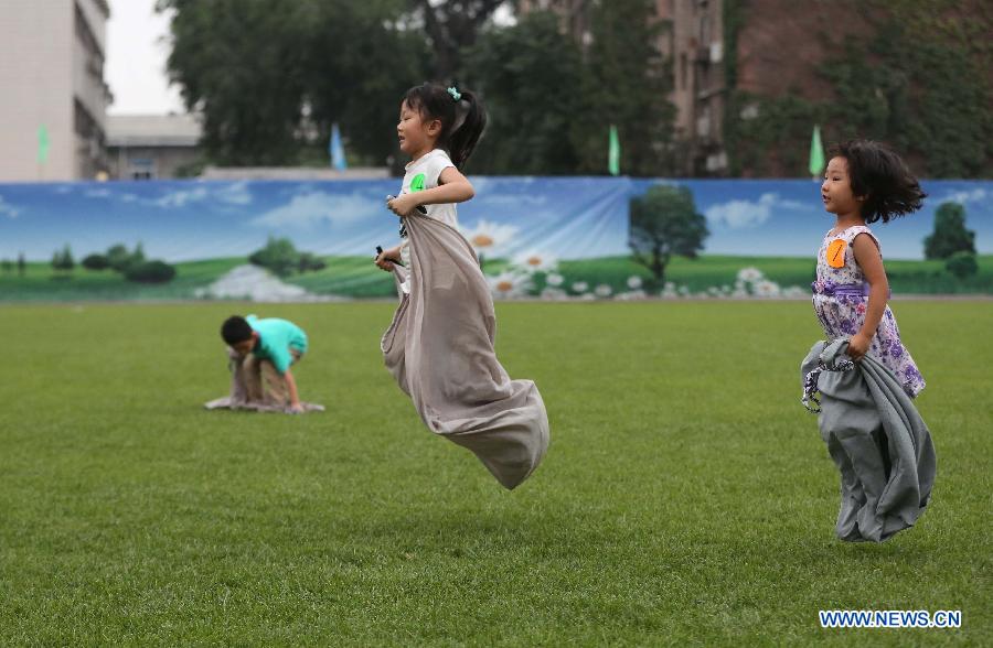 Children participate in a kangeroo jump game during a summer fun event in a community in Beijing, capital of China, July 6, 2015. (Xinhua/Yin Gang)