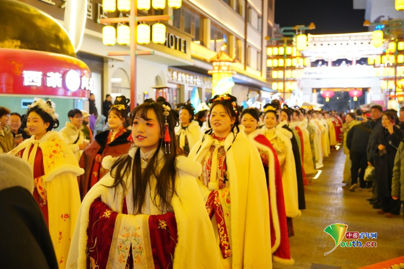 The lantern show adorned the ancient city with over twenty themed lantern groups and thousands of colorful lanterns, also featuring events like a lion dance competition and a traditional Chinese costume show. Additionally, the drone light show was staged over the sky, using technology to outline different patterns to convey Chinese New Year blessings. Photo/CFP