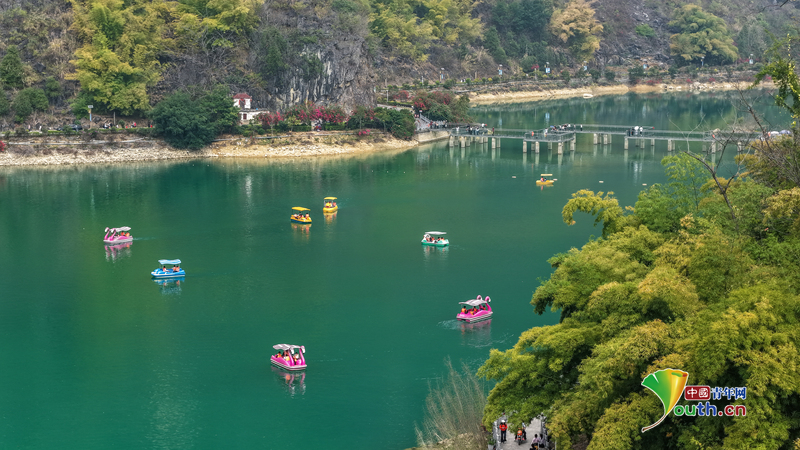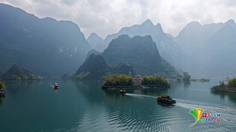 Beijing, February 26 (Youth.cn) - On February 22, 2026, at Haokun Lake in Lingyun County, Baise City, Guangxi Zhuang Autonomous Region, the picturesque landscape of lakes and mountains attracted tourists to enjoy the scenery and relax during the holiday. Photo/CFP