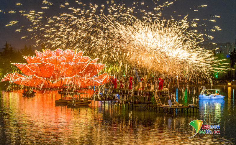 Beijing, February 26 (Youth.cn) - On the evening of February 25, 2026, as the Lantern Festival approaches, citizens viewed lanterns and watched the intangible cultural heritage performance of “Datiehua” (flying iron fireworks) at the Sui and Tang Dynasties City Ruins Botanical Garden in Luoyang City, Henan Province. The garden was filled with a joyful and festive atmosphere. Photo/CFP