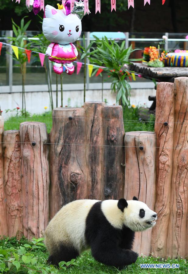 Giant panda Chu Xin has fun during the birthday party at the panda hall of Siberian Tiger Park in Changchun, northeast China's Jilin Province, July 30, 2020. A birthday party was held to celebrate the fourth birthday of giant pandas Chu Xin and Mu Yun on Thursday. (Xinhua/Lin Hong)