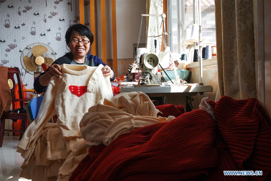 Villager Xu Fen displays a woollen sweater made by her at home in Kaixiangong Village of Wujiang District in Suzhou, east China''s Jiangsu Province, Oct. 17, 2020. Through years of development, Kaixiangong Village has developed from a hamlet with the per capita income of about 110 yuan (about 16.4 U.S. dollars) in the year of 1978 into a countryside with the per capita disposable income reaching 35,800 yuan (5,344.9 U.S. dollars) in 2019. (Xinhua/Yang Lei)