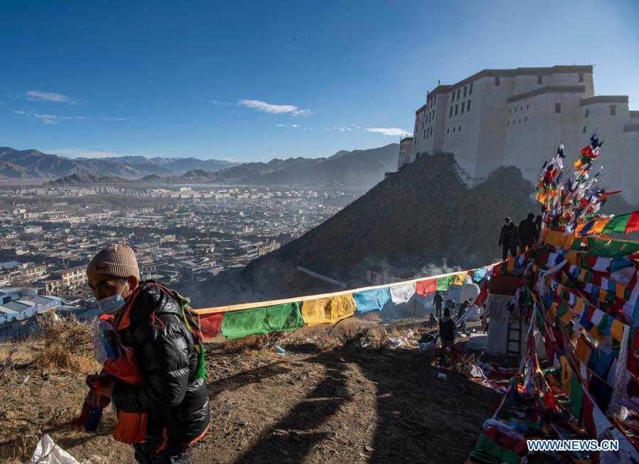 Tibetan people hang prayer flags on top of a mountain in Xigaze, southwest China's Tibet Autonomous Region, Jan. 15, 2021. Friday marks the third day of the farmers' New Year celebrated in Xigaze according to the Tibetan lunar calendar. In tradition, people here would go early this morning to hang new prayer flags on top of mountains and their home roofs, praying for peace and prosperity of their country. (Xinhua/Sun Fei)