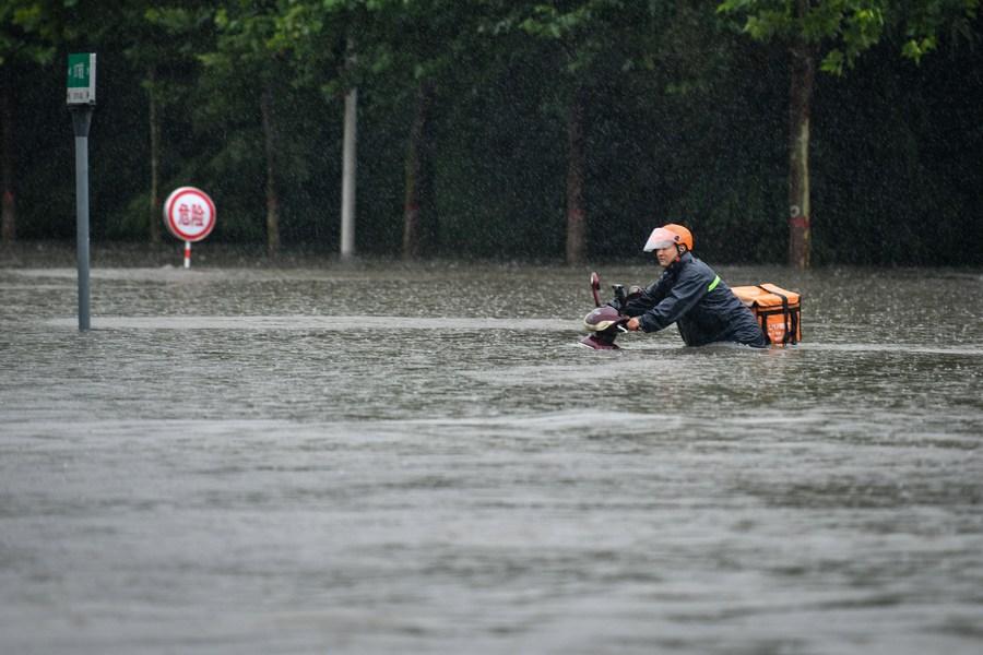 A courier wades through a waterlogged road in Zhengzhou, capital of central China's Henan Province, July 20, 2021.(Photo by Hou Jianxun/Xinhua)