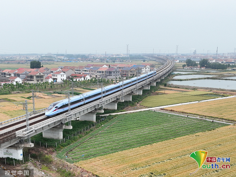 On May 26th, 2023, in Songzhuang Town, Ganyu District, Lianyungang City, Jiangsu Province, a high-speed train raced across vast stretches of wheat fields, where waves of wheat rolled like a sea, showcasing a scene of abundant harvest. Photo/ VCG