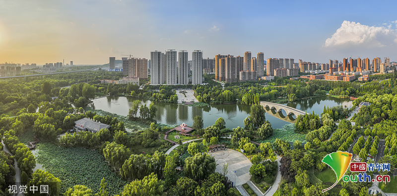 On July 16th, 2023, at Longtan Park in Xuecheng District, Zaozhuang City, Shandong Province, the blue sky, green trees, white clouds and city buildings constitute a natural landscape painting. Photo/ VCG
