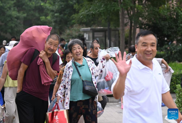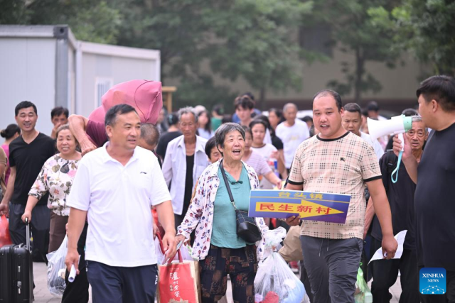 Villagers get their personal belongings and prepare to go home from a relocation site in Xiqing District, north China's Tianjin Municipality, Aug. 20, 2023. All of over 37,000 relocated villagers from the Dongdian flood storage and retention area in Jinghai District of north China's Tianjin have returned to their homes as floodwater receded. (Xinhua/Sun Fanyue)
