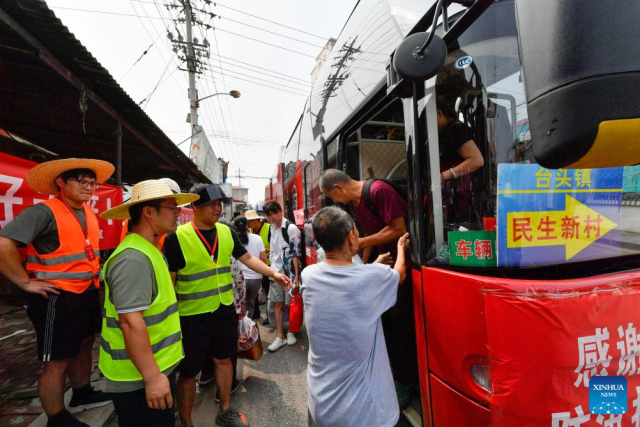 Villagers come back home in buses in Taitou Town of Jinghai District, north China's Tianjin Municipality, Aug. 20, 2023. All of over 37,000 relocated villagers from the Dongdian flood storage and retention area in Jinghai District of north China's Tianjin have returned to their homes as floodwater receded. (Xinhua/Sun Fanyue)