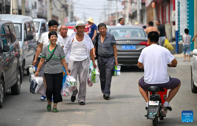 Villagers greet each other as they are back home in Taitou Town of Jinghai District, north China's Tianjin Municipality, Aug. 20, 2023. All of over 37,000 relocated villagers from the Dongdian flood storage and retention area in Jinghai District of north China's Tianjin have returned to their homes as floodwater receded. (Xinhua/Sun Fanyue)