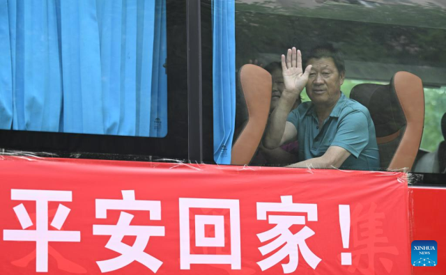 Villagers wave in a bus as they are going back home from a relocation site in Xiqing District, north China's Tianjin Municipality, Aug. 20, 2023. All of over 37,000 relocated villagers from the Dongdian flood storage and retention area in Jinghai District of north China's Tianjin have returned to their homes as floodwater receded. (Xinhua/Sun Fanyue)