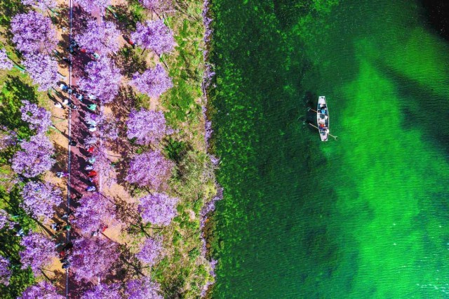 Salvage workers remove trash from the Tongle section of the Puyang River in Pujiang county, Jinhua city, Zhejiang province, in March. XU YU/XINHUA