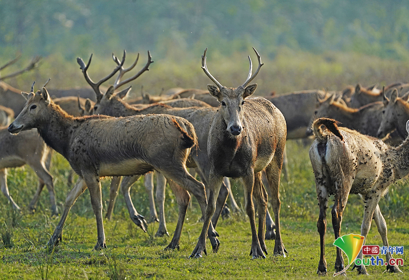 Beijing, October 16 (Youth.cn) - A photo taken on October 15th, 2023 show the elks in the Swan Island National Nature Reserve in Shishou, Jingzhou City, Hubei Province. This year, more than 400 young elks were born in the reserve, and the number of elks in the reserve exceeded 2000 for the first time.