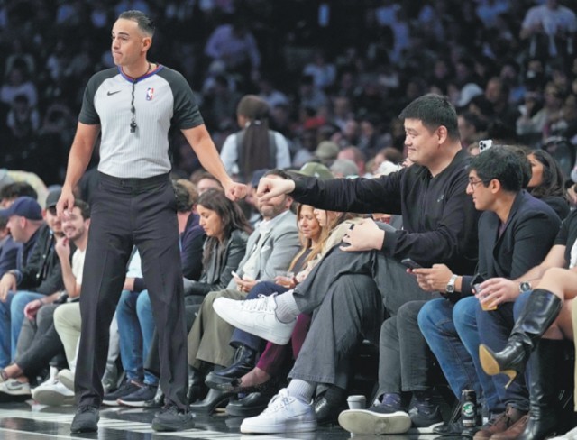 Yao Ming fist-bumps with a match official during the NBA game between the Cleveland Cavaliers and Brooklyn Nets last Wednesday at Barclays Center New York. NBAE/GETTY IMAGES