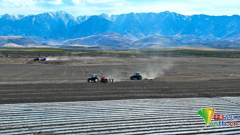 On March 27th, 2024, in Zhangye City, Gansu Province, at the wheat planting base of Jinhua Village Planting Cooperative in Huazhai Township, Ganzhou District which is located at the foot of the Qilian Mountains, farmers were using sowing machinery guided by Beidou navigation and pulled by autonomous driving tractors. Photo/ VCG