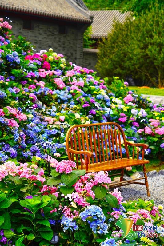 Hydrangeas sea was installed on Wangfujing street. With architectures as background, colorful flowers look like “Monet Garden”. People came to see the new landscape on May Day vocation and took photos there. Photo/VCG
