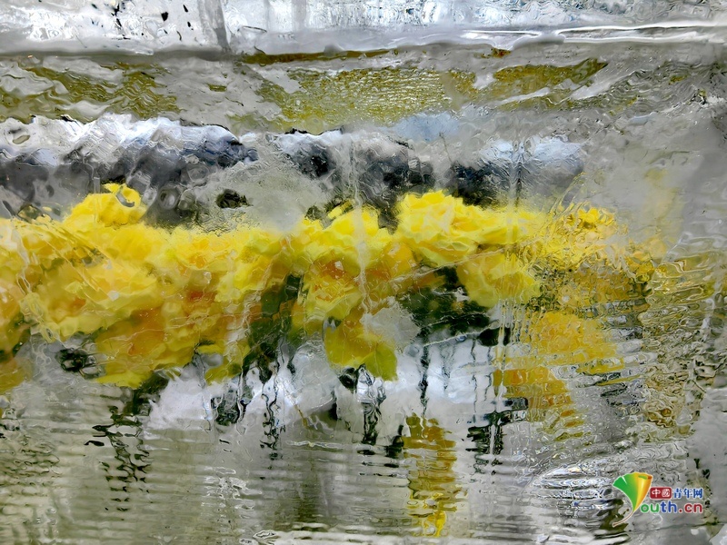 Beijing, December 17 (Youth.cn) - On December 16, 2024, citizens are taking pictures of the ice wall of frozen roses outside the Wanda Plaza of Haxi in Nangang District, Harbin City. These red and yellow roses frozen in ice are silk flowers. Photo/VCG
