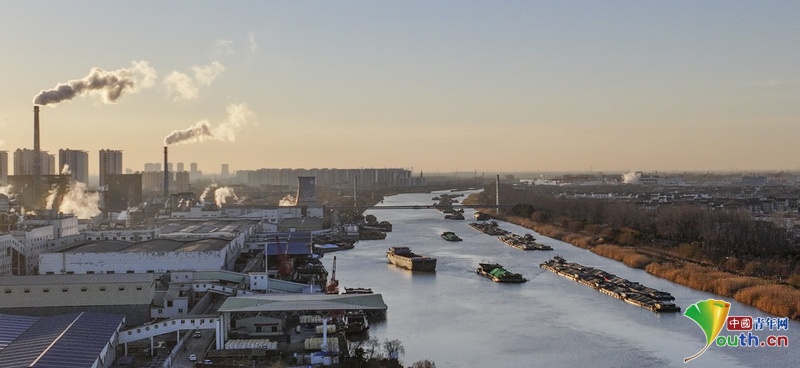 Beijing, January 10 (Youth.cn) - Photo taken alongside the Grand Canal from Beijing to Hangzhou. Cargo ships carried with variety of goods shuttled back and forth on the Grand Canal, appearing a busy scene. Photo/VCG
