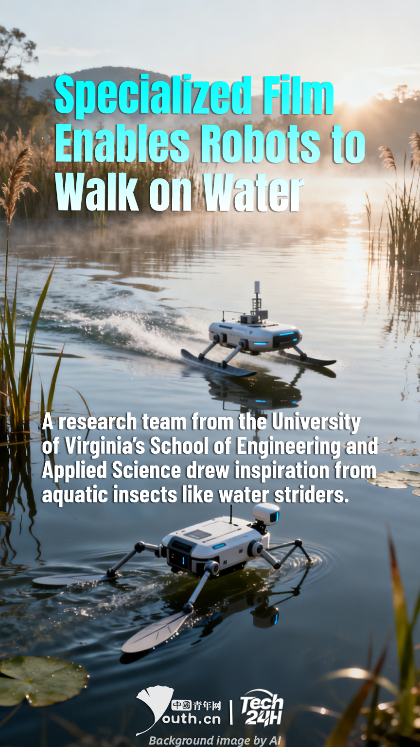 【Tech 24H】A research team from the University of Virginia's School of Engineering and Applied Science drew inspiration from aquatic insects like water striders. The team develops two prototype robots which can "walk on water" through a novel thin film. The two newly developed devices each have distinct features: one, named "HydroFlexor," propels itself by mimicking the fin-like movements of fish, while another, "HydroBuckler," imitates the rowing motion of water striders, "strolling" across the water surface with a unique bending posture.