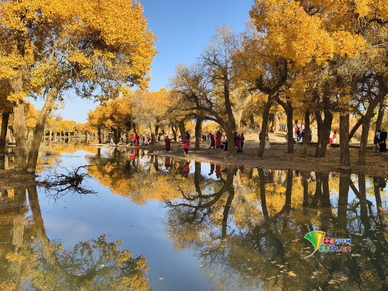 Beijing, October 13 (Youth.cn) - On October 12, 2025, in Alxa League, Inner Mongolia Autonomous Region, the desert poplar forest in Ejine Banner entered its most beautiful period of the year. Tourists were seen walking among the trees, taking to capture the moment. Photo/CFP