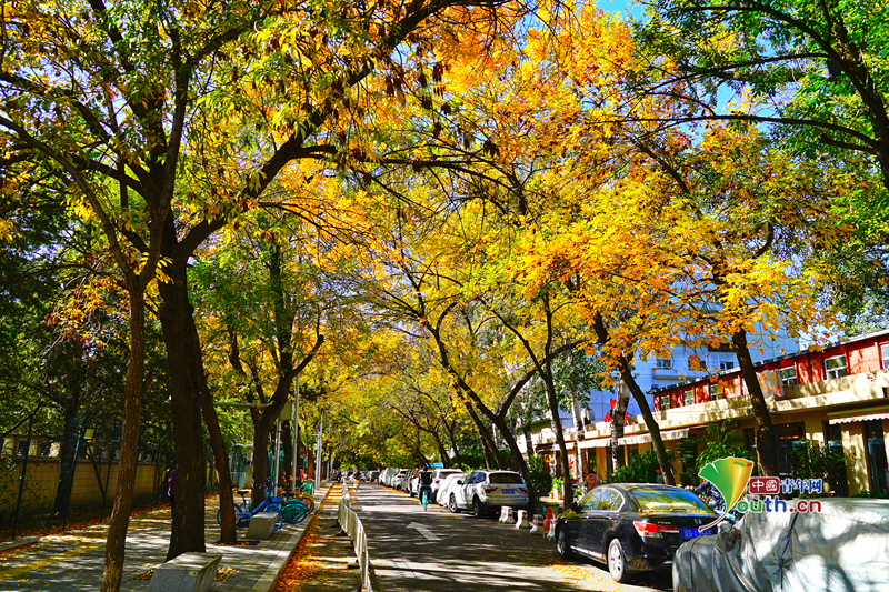 Beijing, October 20 (Youth.cn) - On October 19, 2025, in Beijing, autumn vibes were strong on Sanlitun Xiwu Street. Sunlight filtered through the trees, casting light on the fallen leaves of the road, which attracted many citizens to come and take photos. Photo/CFP