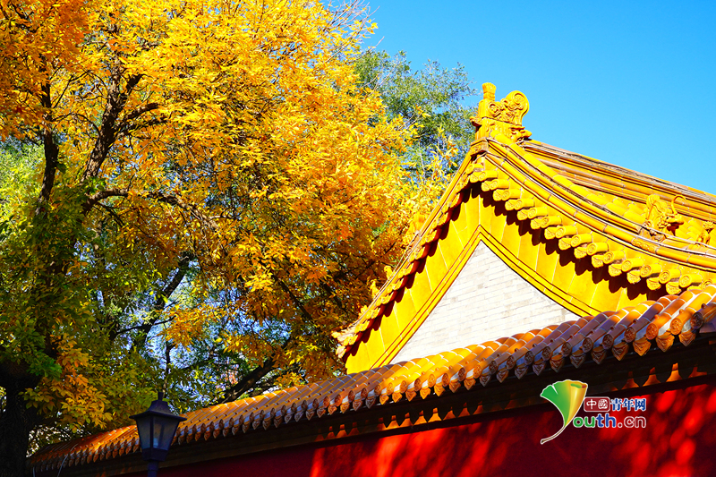 Beijing, October 22 (Youth.cn) - On October 19, 2025, in Beijing, the ash tree leaves in North Luogu Lane have turned a golden yellow. Their brilliance, set against the red walls and yellow tiles of the Fortune-Boosting Temple of Wealth, creates a breathtaking view. Photo/CFP