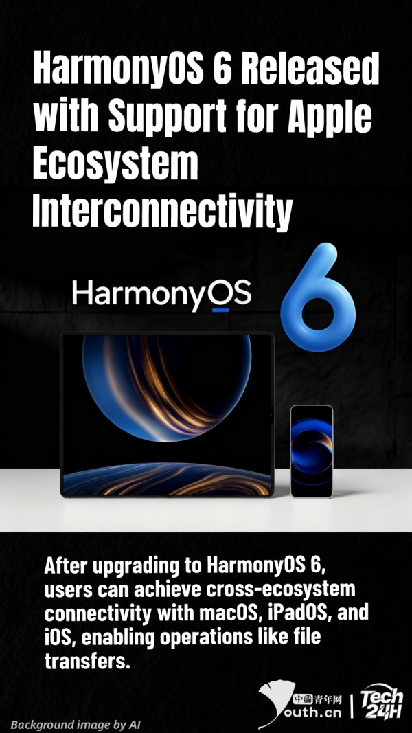 【#Tech24H】On October 22, Huawei held a special launch event for HarmonyOS 6, officially announcing that the new system would begin rolling out on the same day. Devices such as the Mate X6, Pura X, and Huawei Mate70 series can now upgrade to the new system via the public beta version. After upgrading to HarmonyOS 6, users can achieve cross-ecosystem connectivity with macOS, iPadOS, and iOS, enabling operations like file transfers.