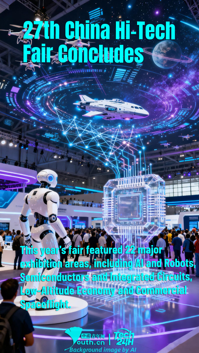 【#Tech24H】The 27th China Hi-Tech Fair concluded in Shenzhen, Guangdong Province, on November 16. This year's fair featured 22 major exhibition areas, including AI and Robots, Semiconductors and Integrated Circuits, Low-Altitude Economy and Commercial Spaceflight. Over 5,000 new products and achievements were unveiled. More than 1,000 procurement groups from over 120 countries and regions attended, resulting in 1,023 on-site signed projects and intended transaction value exceeding 170 billion yuan.