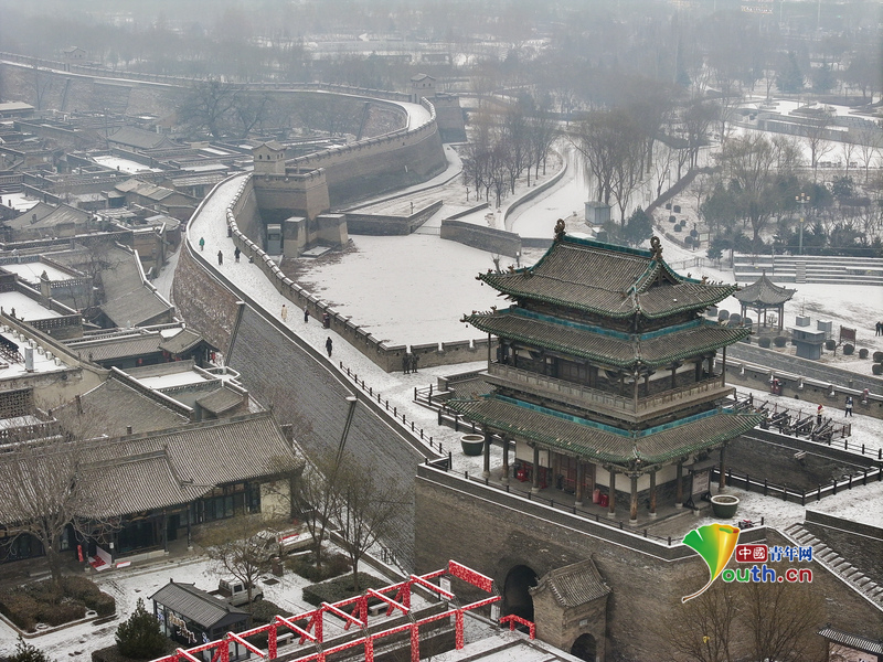 Bejing, January 26 (Youth.cn) - On January 26, 2026, affected by a cold air mass, Pingyao County in Jinzhong, Shanxi, experiences snowfall. The snow-covered Pingyao Ancient City, draped in silver, resembles an ink-wash painting. Photo/CFP