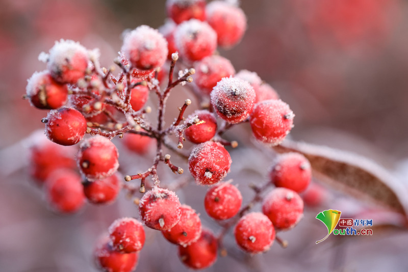 Beijing, January 27 (Youth.cn) - On January 24, 2026, in Huaian, Jiangsu, nandina plants along the ancient Huai River glowed with vibrant colors under a layer of frost, presenting a uniquely beautiful scene. Photo/CFP