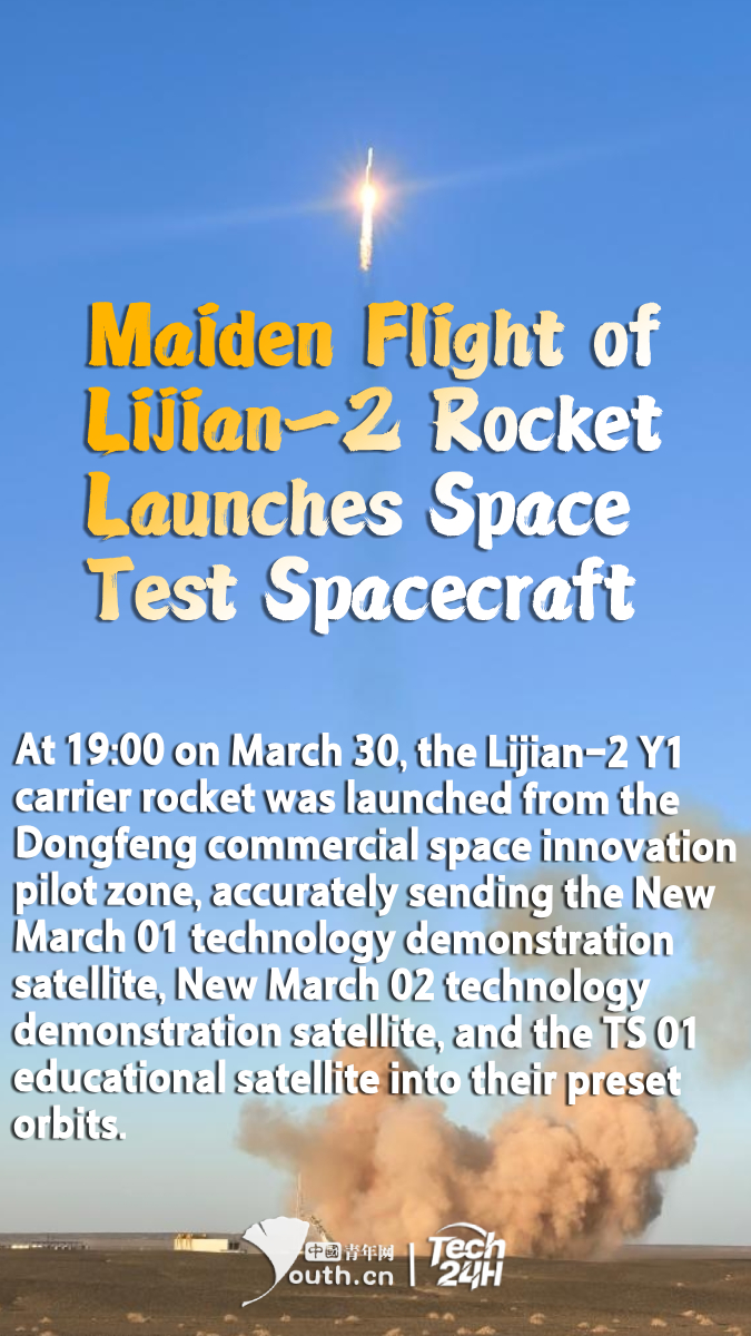 【#Tech24H】At 19:00 on March 30, the Lijian-2 Y1 carrier rocket was launched from the Dongfeng commercial space innovation pilot zone, accurately sending the New March 01 technology demonstration satellite, New March 02 technology demonstration satellite, and the TS 01 educational satellite into their preset orbits. The launch mission was a complete success. Among them, the New March 02 satellite, also known as the Qingzhou prototype test spacecraft, has a three-year on-orbit operational capability, weighs 4.2 tons, and adopts a single-cabin integrated configuration design. The New March 01 satellite, functioning as a “mini space laboratory”, will conduct a series of on-orbit tests and application demonstrations using multiple commercial off-the-shelf (COTS) experiment devices. This launch marked the maiden flight of the Lijian-2 carrier rocket.