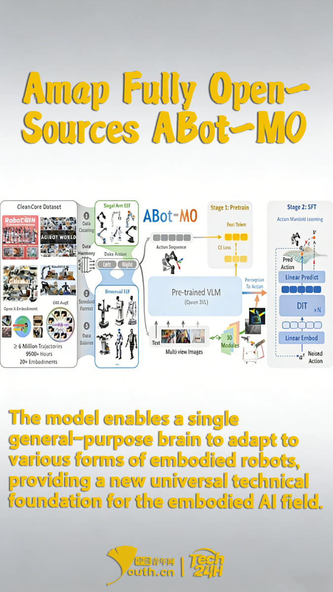 【#Tech24H】Amap has announced the full open-sourcing of ABot-M0, the world’s first unified-architecture base model for embodied robotic manipulation. The model enables a single general-purpose brain to adapt to various forms of embodied robots, providing a new universal technical foundation for the embodied AI field. ABot-M0’s unified architecture successfully validates the feasibility of one brain driving multiple robot types, offering a ready-to-use solution for embodied AI deployment.