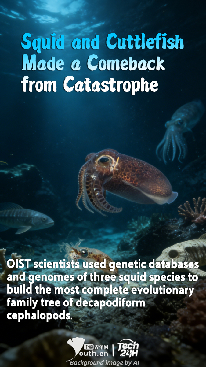 【#Tech24H】Scientists at the Okinawa Institute of Science and Technology (OIST) combined existing genetic databases with newly sequenced genomes of three squid species, and collaborated with an international research team, to reconstruct together the most complete evolutionary family tree of decapodiform cephalopods to date. The results indicate that the ancestors of squid and cuttlefish likely originated in the deep sea. Around the mid-Cretaceous, about 100 million years ago, their ancestors began to rapidly diverge into multiple evolutionary lineages. The real turning point occurred around 66 million years ago. The famous Cretaceous-Paleogene extinction event (K-Pg impact event), which wiped out about three-quarters of all plant and animal species on Earth, including dominant groups like the dinosaurs, made shallow marine environments extremely harsh due to ocean acidification and anoxia. However, some deep-sea areas served as refuges for ancient cephalopods. It was during this period that the evolutionary branches of squid and cuttlefish suddenly increased, gradually giving rise to the rich diversity of species we see today.