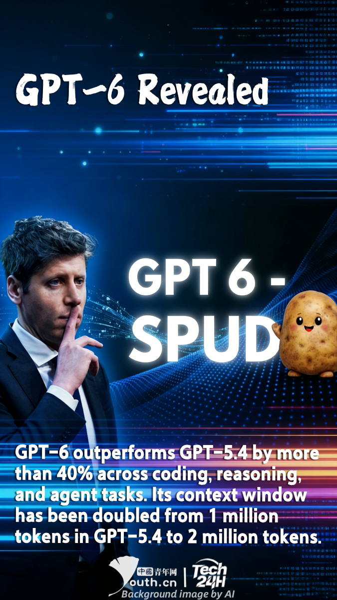【#Tech24H】This internally codenamed “Spud” model, after two years of clandestine research and development, completed pre-training on March 24 at the Stargate data center in Texas, and is expected to be released as early as April. GPT-6 outperforms GPT-5.4 by more than 40% across coding, reasoning, and agent tasks. Its context window has been doubled from 1 million tokens in GPT-5.4 to 2 million tokens. Brockman has repeatedly emphasized a key positioning: GPT-6 is an entirely new foundational model that will serve as the base for all future OpenAI models.