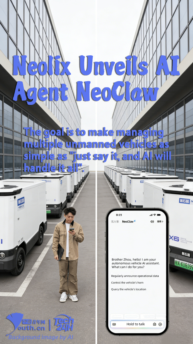 【#Tech24H】Unmanned delivery company Neolix has unveiled its AI agent NeoClaw, which deploys artificial intelligence in frontline scenarios such as fleet management, complex task scheduling, and operational data analysis. The goal is to make managing multiple unmanned vehicles as simple as “just say it, and AI will handle it all”. With NeoClaw’s built-in core capabilities for fleet management, vehicle control, data querying, and analytics, whether it is directing unmanned vehicles for deliveries, batch operating vehicles, or more complex tasks like batch-checking vehicle status, arranging charging, or analyzing operational data, users only need to tell NeoClaw what to do, and NeoClaw can easily get it done.