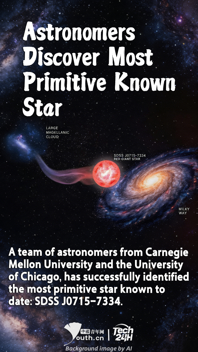 【#Tech24H】A team of astronomers from Carnegie Mellon University and the University of Chicago, combining data from the fifth phase of the Sloan Digital Sky Survey (SDSS) with observations from the Magellan Telescope in Chile, has successfully identified the most primitive star known to date: SDSS J0715-7334. In astronomy, all elements heavier than helium are collectively called “metals”. Stars with extremely low metal content are known as “primitive stars” or “metal-poor stars”. SDSS J0715-7334 belongs to the second generation of stars and is a red giant. Spectroscopic and chemical analysis from the Magellan Telescope shows that its metal content is less than 0.005% of that of the Sun, one-half that of the previous record holder and just one-fortieth of the most iron-poor star known, setting a new observational record. Using data from the European Space Agency’s Gaia probe, the team traced the star’s trajectory. It originally formed near the Large Magellanic Cloud and now “resides” in the Milky Way, about 80,000 light-years from Earth.