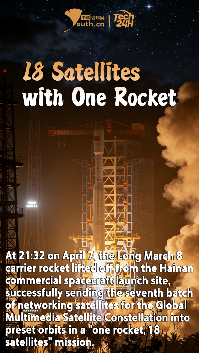 【#Tech24H】At 21:32 on April 7, the Long March 8 carrier rocket lifted off from the Hainan commercial spacecraft launch site, successfully sending the seventh batch of networking satellites for the Global Multimedia Satellite Constellation into preset orbits in a “one rocket, 18 satellites” mission. The Long March 8 is a new-generation medium-lift two-stage liquid-propellant carrier rocket developed by China Aerospace Science and Technology Corporation (CASC). It has a payload capacity of no less than 5.5 metric tons to a 700-km sun-synchronous orbit. The Global Multimedia Satellite is developed and operated by Shanghai Spacesail Technology Co., Ltd., focusing on providing high-speed, real-time, secure, and reliable integrated space-air-ground-sea solutions and services for the Belt and Road Initiative and Chinese enterprises going global.
