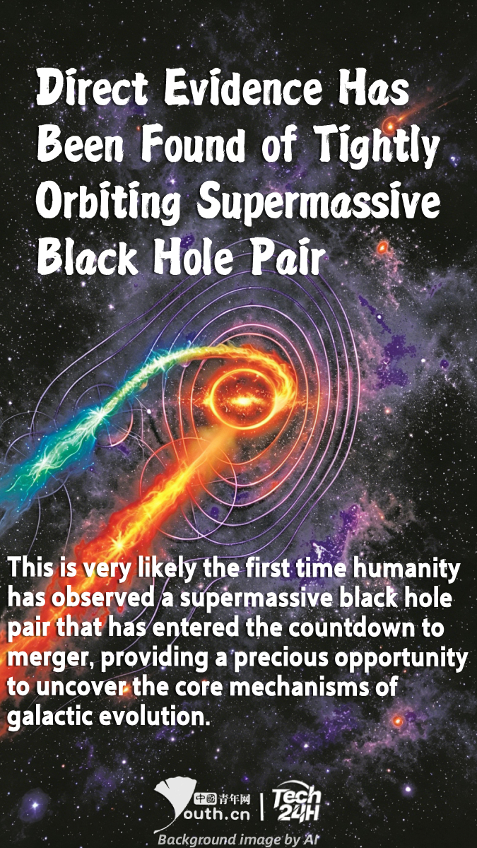 【#Tech24H】A research team from the Max Planck Institute for Radioastronomy in Germany has announced that, after 23 years of high-resolution radio observations, they have inferred the presence of two supermassive black holes orbiting each other with a period of approximately 121 days at the center of the galaxy Mrk 501. The distance between them is between 250 and 540 times the Earth-Sun distance. Due to gravitational wave radiation, their orbit will continue to shrink. Theoretical projections indicate that they could merge within as little as a hundred years. This is very likely the first time humanity has observed a supermassive black hole pair that has entered the countdown to merger, providing a precious opportunity to uncover the core mechanisms of galactic evolution.