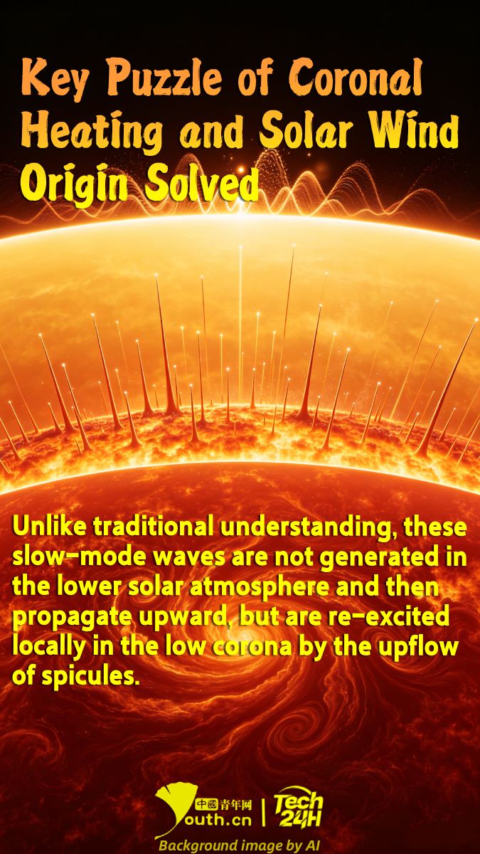 【#Tech24H】The Yunnan Observatories of the Chinese Academy of Sciences, in collaboration with research teams from India and the UK, has achieved significant progress in the study of coronal heating and solar wind origin in coronal hole regions, providing new evidence for understanding the heating mechanism of stellar atmospheres. Through simulation studies, the team has, for the first time, fully reproduced the entire physical process from the solar convection zone to the low corona, including the self-excitation of convective turbulence and the spontaneous generation of spicules. The simulation shows that convective and turbulent motions trigger small-scale magnetic reconnection and shock structures, which together drive the periodic generation of spicules. As spicules rise, the plasma flows they carry into the corona continuously excite slow-mode waves and shocks locally, and the associated energy flux is effectively dissipated through thermal conduction and compression, directly heating the low corona. Unlike traditional understanding, these slow-mode waves are not generated in the lower solar atmosphere and then propagate upward, but are re-excited locally in the low corona by the upflow of spicules.