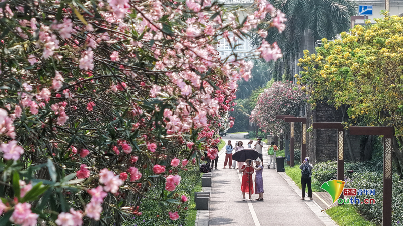 Beijing, April 14 (Youth.cn) - On April 13, 2026, oleanders quietly burst into bloom along the riverbank on the south bank of the Yongjiang River in Nanning City. Their brilliant flowers drew numerous citizens to admire and photograph them. Photo/CFP